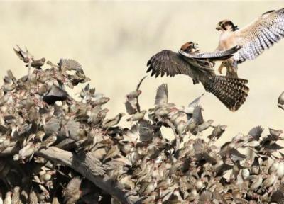 حمله دو شاهین برای شکار در میان یک دسته از هزاران پرنده به جنگ تمام عیار میان این دو پرنده تبدیل شد! این صحنه شگفت انگیز در پارک فرا مرزی کگالاگادی پخش شد.