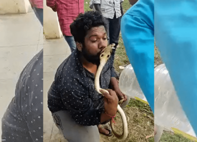 یک شهروند هندی که در حین نمایش عجیب و غریب کوشش کرد تا سر یک مار کبرا را ببوسد به سختی مجازات شد.